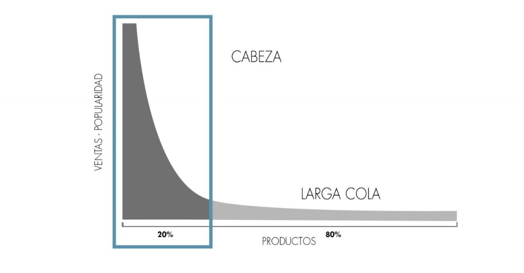 El modelo tradicional, se rige por el principio de Pareto, nos dice que el 20% de los productos de gran demanda nos generan el 80% de las ventas, por esto los artículos de menor demanda se hacían poco rentables debido a los altos costes de fabricación, almacenamiento, distribución y comercialización.