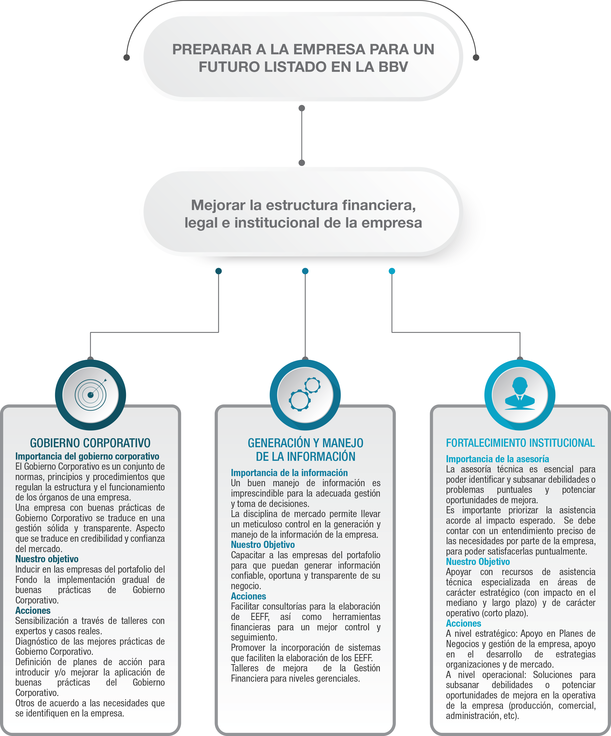 El Programa de Asistencia Técnica para las empresas de Impulsor FIC, se centra en tres pilares: Gobierno Corporativo, Generación y manejo de la información y Fortalecimiento Institucional. El objetivo del Programa es el de coadyuvar al empoderamiento de la estructura financiera, legal e institucional de las empresas para un futuro listado en la Bolsa de Valores.